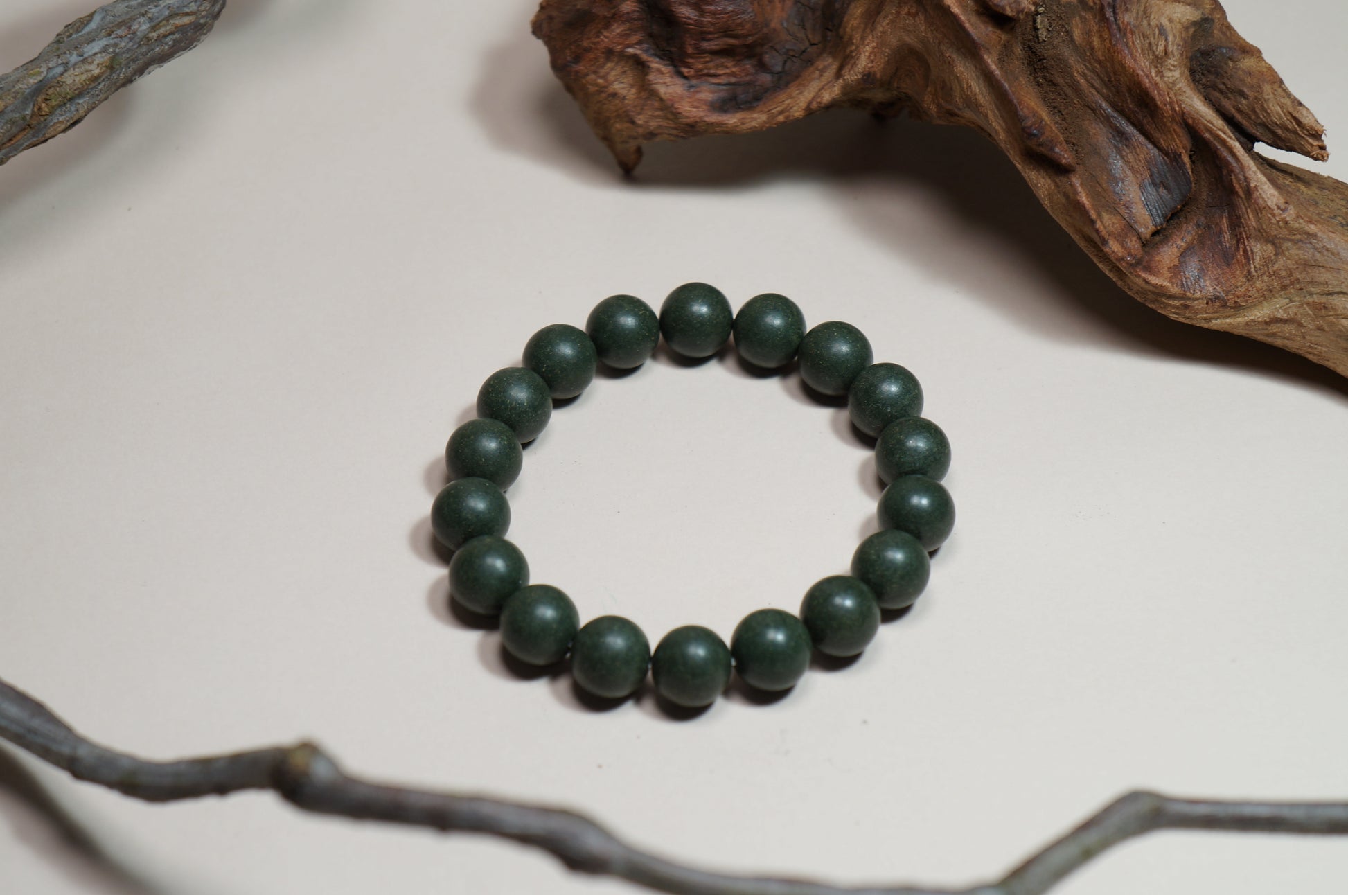 Matte deep-green beads with a smooth, stone-like touch, each one individually formed and lightly polished; subtle variations in tone keep the bracelet looking organic, relaxed, and earthy rather than overly shiny or plastic.