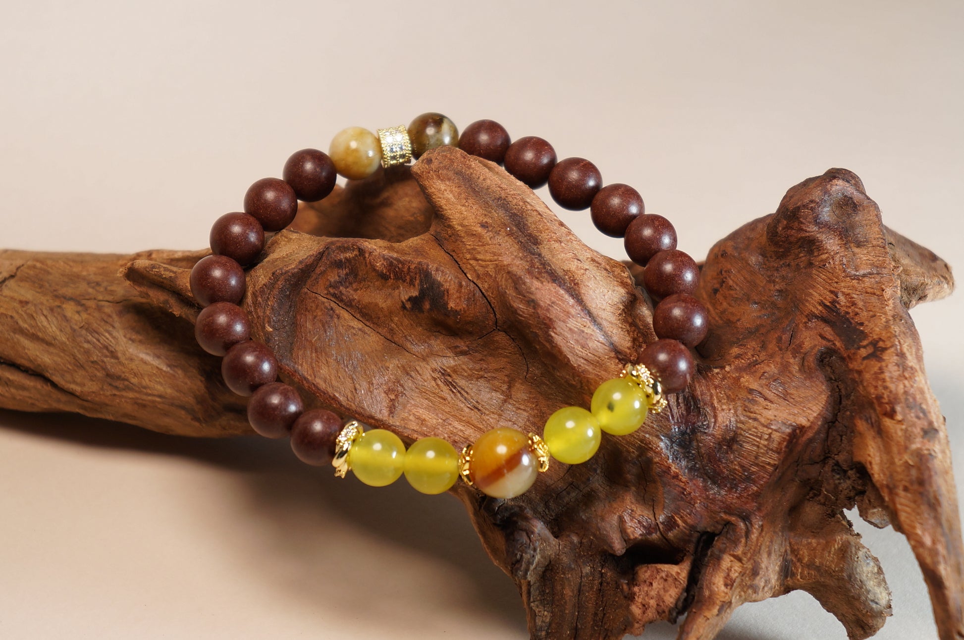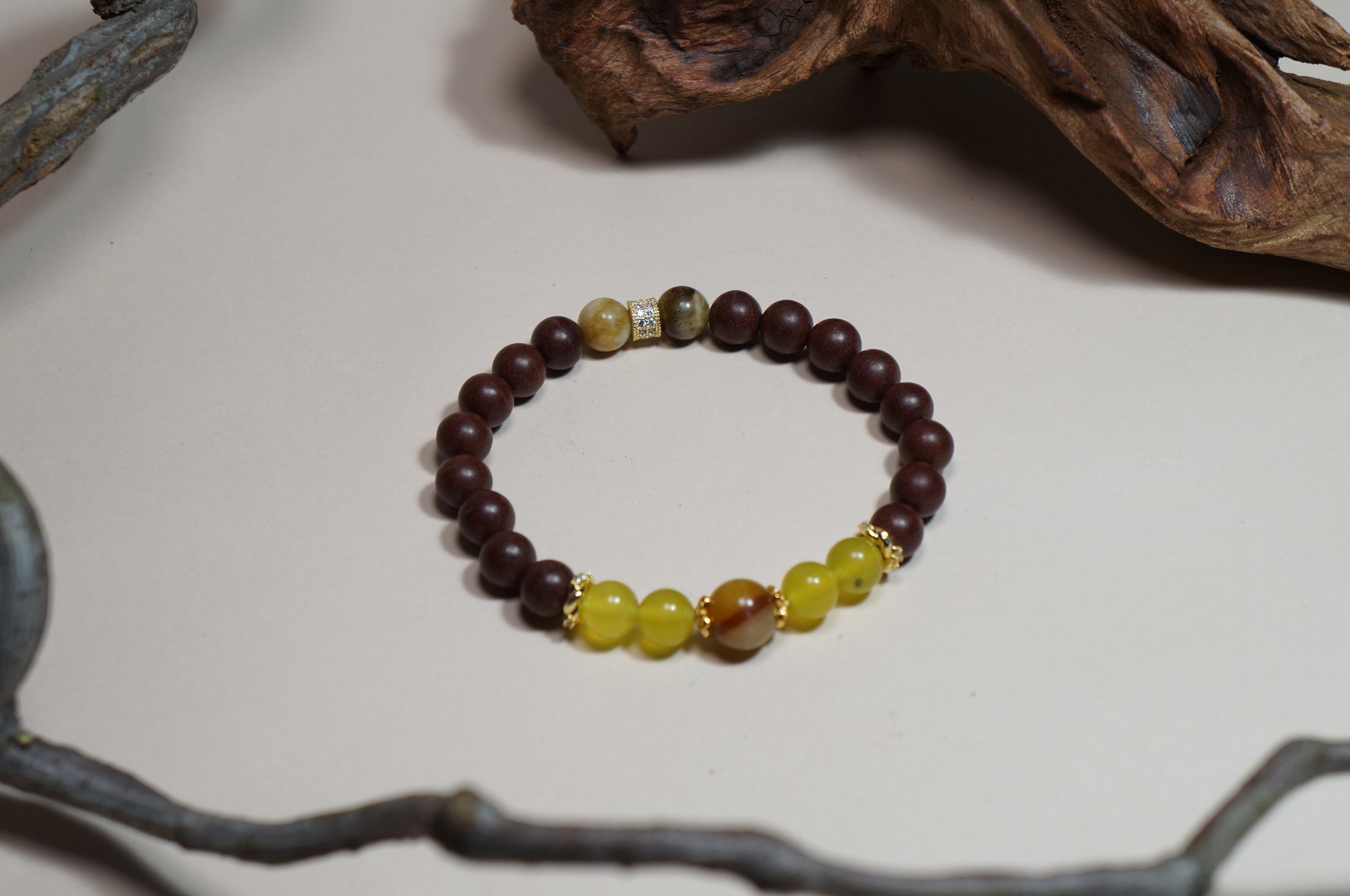 Deep reddish Five Elements Fire herbal beads form the base of this bracelet, accented at the front with a cluster of yellow-green jade beads and small gold-tone spacers—like a spark of flame on the wrist. In the Five Elements system, Fire is linked with passion, visibility, and action, making this piece a good choice when you want more courage and presence.