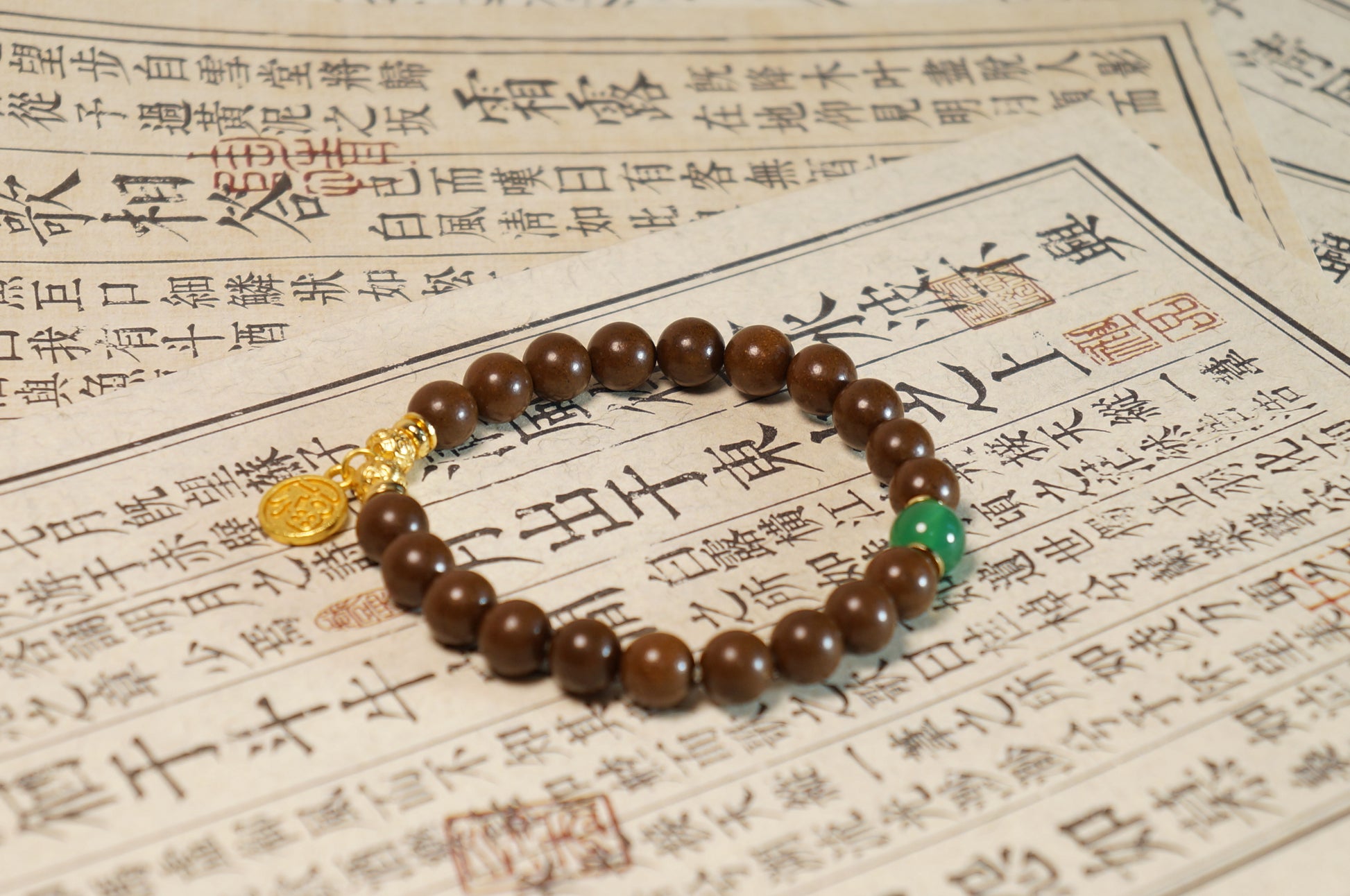 Herbal beads are infused with orchid as the main note, supported by botanicals like atractylodes, poria, and patchouli for a clean, tea-like floral-herbal character rather than a strong perfume blast. The green jade bead is traditionally associated with peace and stability, while the gold-tone charm adds a subtle point of light.
