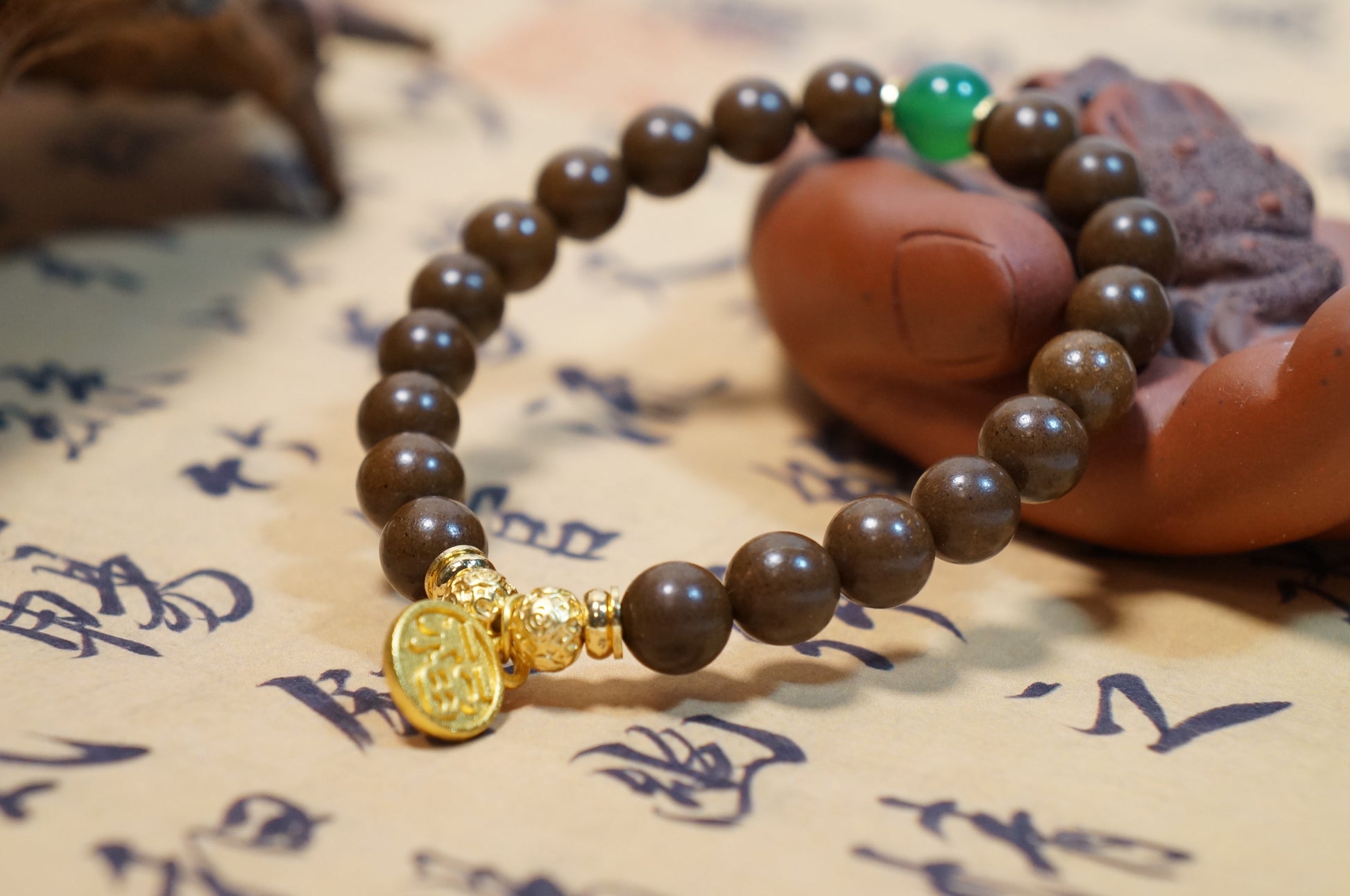 Deep brown orchid-scented herbal beads circle the wrist, finished with a rich green jade bead and a small gold-tone accent. The look is quiet and refined—like wearing a single orchid branch—symbolizing personal space, calm rhythm, and staying composed in a busy day.